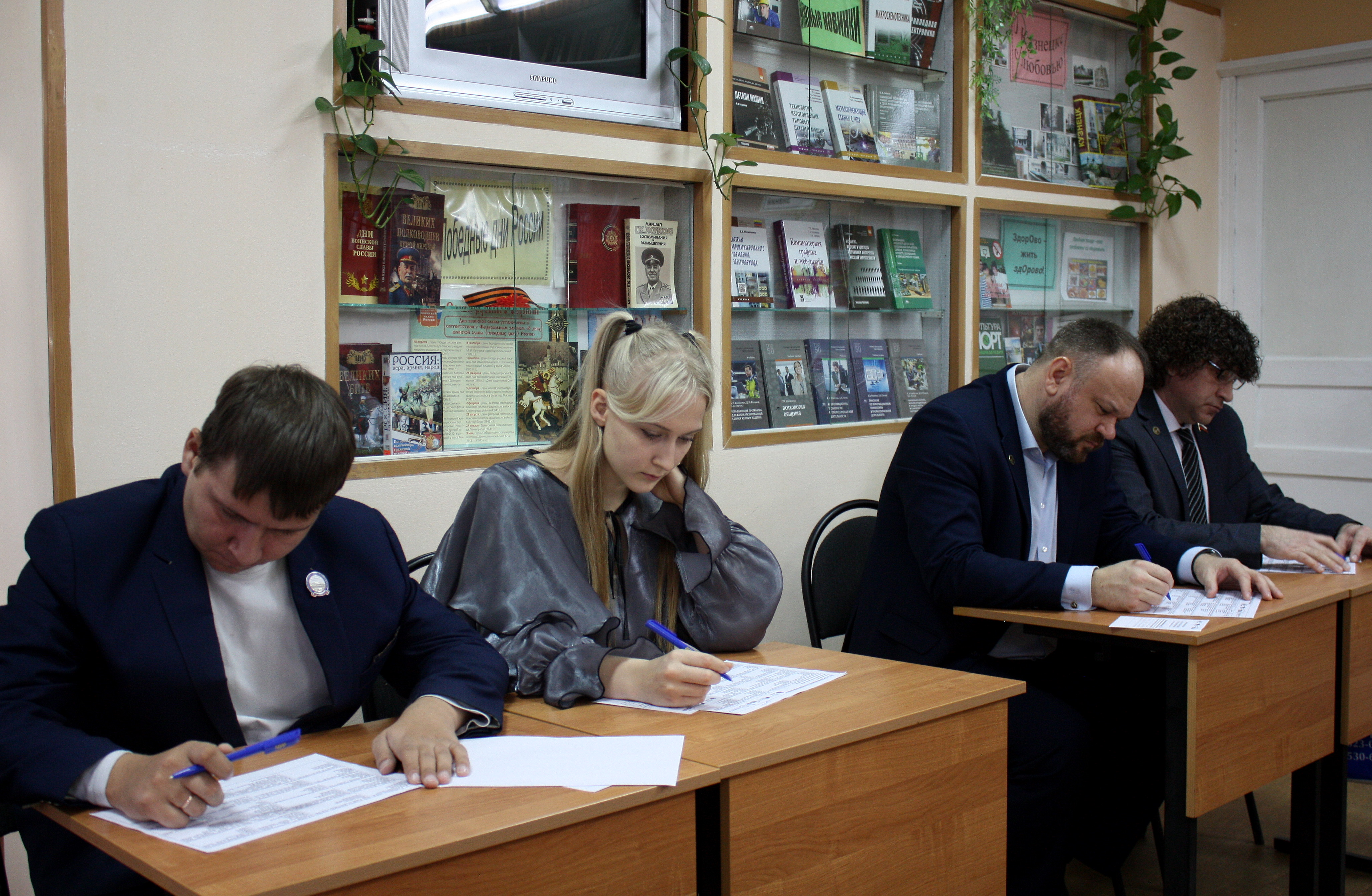 Депутат Молодежного парламента Алексей Молебнов рассказал участникам о правилах проведения теста, после чего совместно со студентами гости ответили на 40 вопросов, охватывающих различные периоды войны.