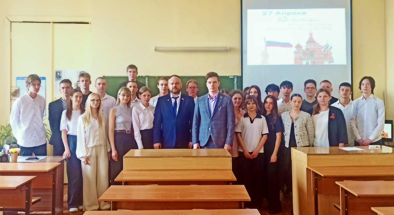 24 апреля в преддверии Дня российского парламентаризма депутат Законодательного Собрания Пензенской области от ЛДПР, заместитель председателя комитета по бюджетной, налоговой и финансовой политике Александр Васильев и депутат Молодёжного парламента при региональном парламенте Александр Марщиков провели встречу с учениками гимназии №1 города Кузнецка