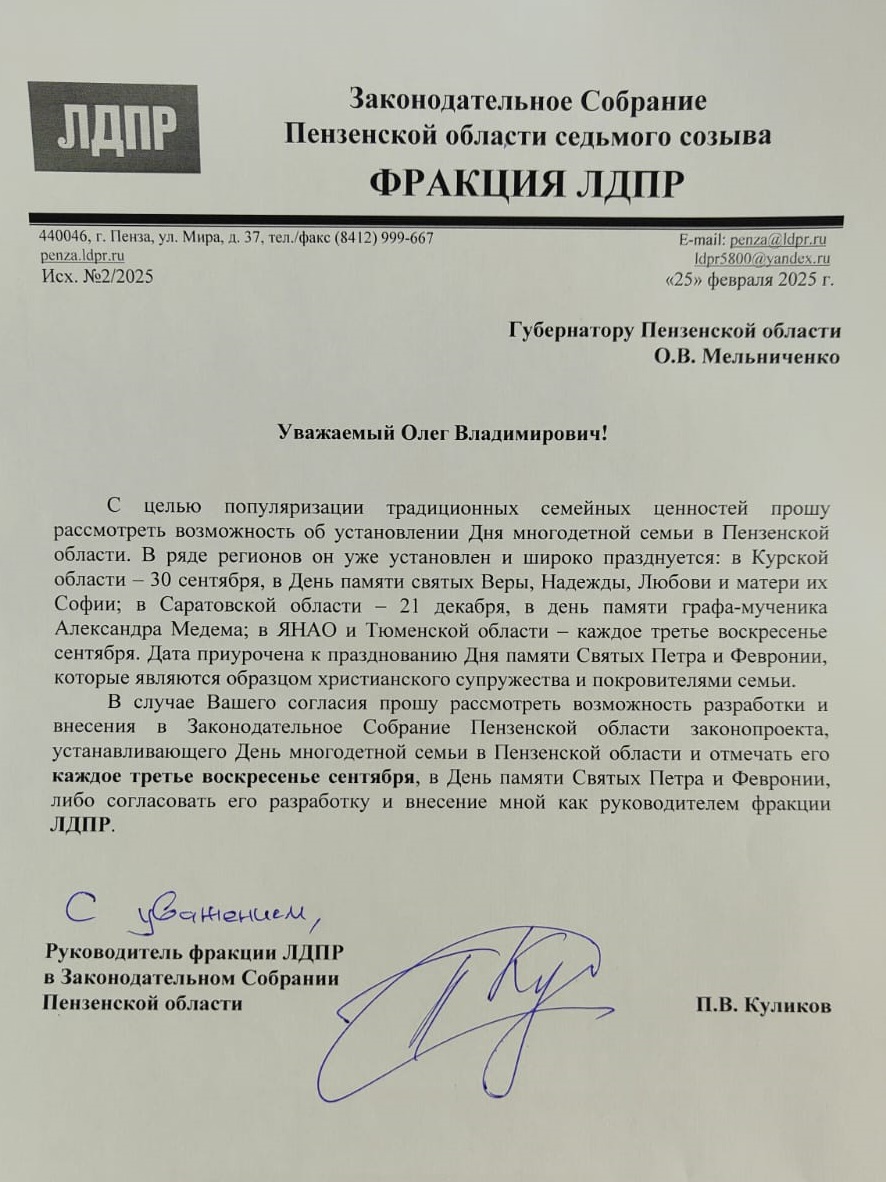 Руководитель фракции ЛДПР в Законодательном Собрании Пензенской области Павел Куликов напомнил, что обращался к главе региона с аналогичным предложением в конце февраля текущего года. В итоге идея была поддержана и принята.