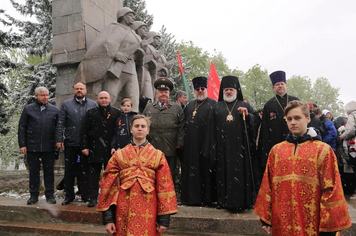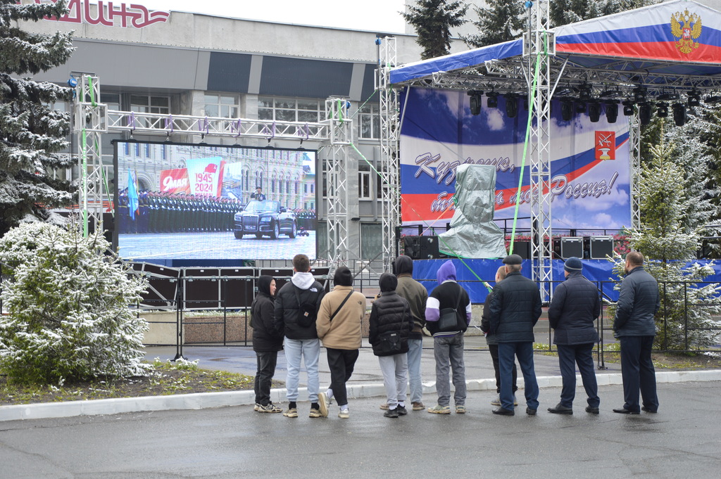 После митинга состоялась церемония возложения цветов к Вечному огню у памятника трём солдатам. На экранах, установленных на центральной площади, жители города смогли посмотреть трансляцию парада на Красной площади в Москве.
